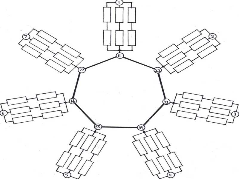 The little rectangular boxes represent the individual coils and the numbers in them are their relative position around the stator. The black dots show the start end of the coil winding. The circles show the tagstrip terminations and their corresponding numbers are within. The above circuit is how an independant 7ph 2p coil arrangement looks like. The next pic shows the diagram for a star connection: