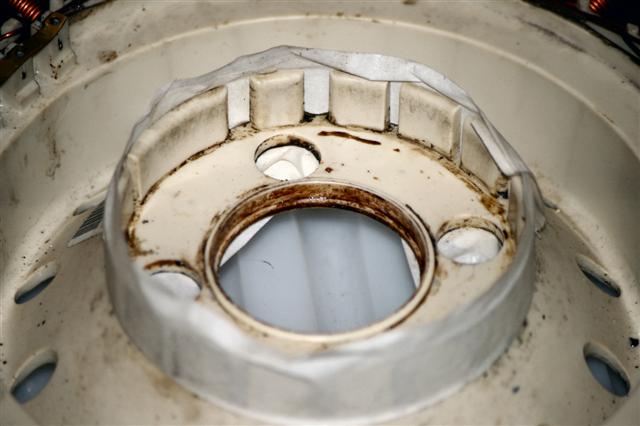 Now the stator, I should have cleaned it up a bit more but I was born lazy. I have used masking tape to block the holes in the stator and wrap around the lugs on this side of the stator.