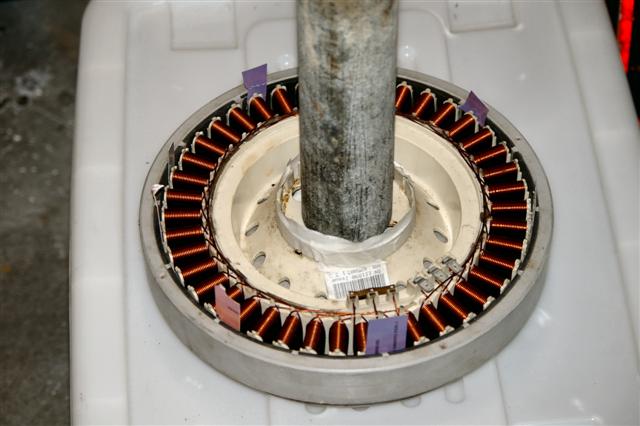 Here is what it should look like when finished! Notice that I have used hose clips around the lugs of the stator as the resin does not stick to the stator which I think is a good thing as it enables me to change the stator easily. (Dont be distracted by the cut-away stator, thats part of another story!