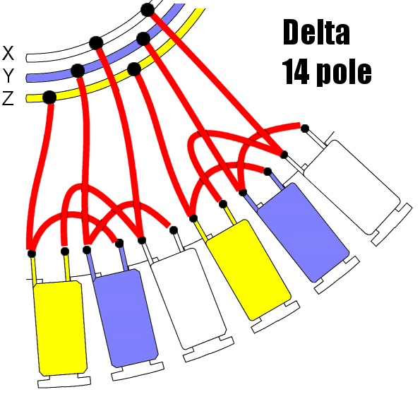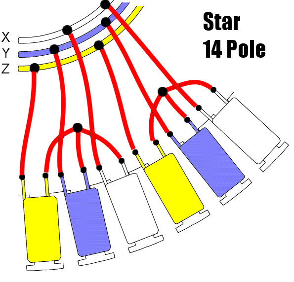 Thanks for the help and didn't think of doing this. Just little confused about how the F&P hub comes from factory is it already wired up as 14pole star as a standard. Then on your pic on top would this be star/delta or series/parallel setup. I will post pics as I build and going to use a coupler from F&P hub to main shaft on VAWT, well my plan anyhow. I think I am the only rare bird with a F&P hub, must be nice to have them so common there. I am back on my feet and making good progress slowly