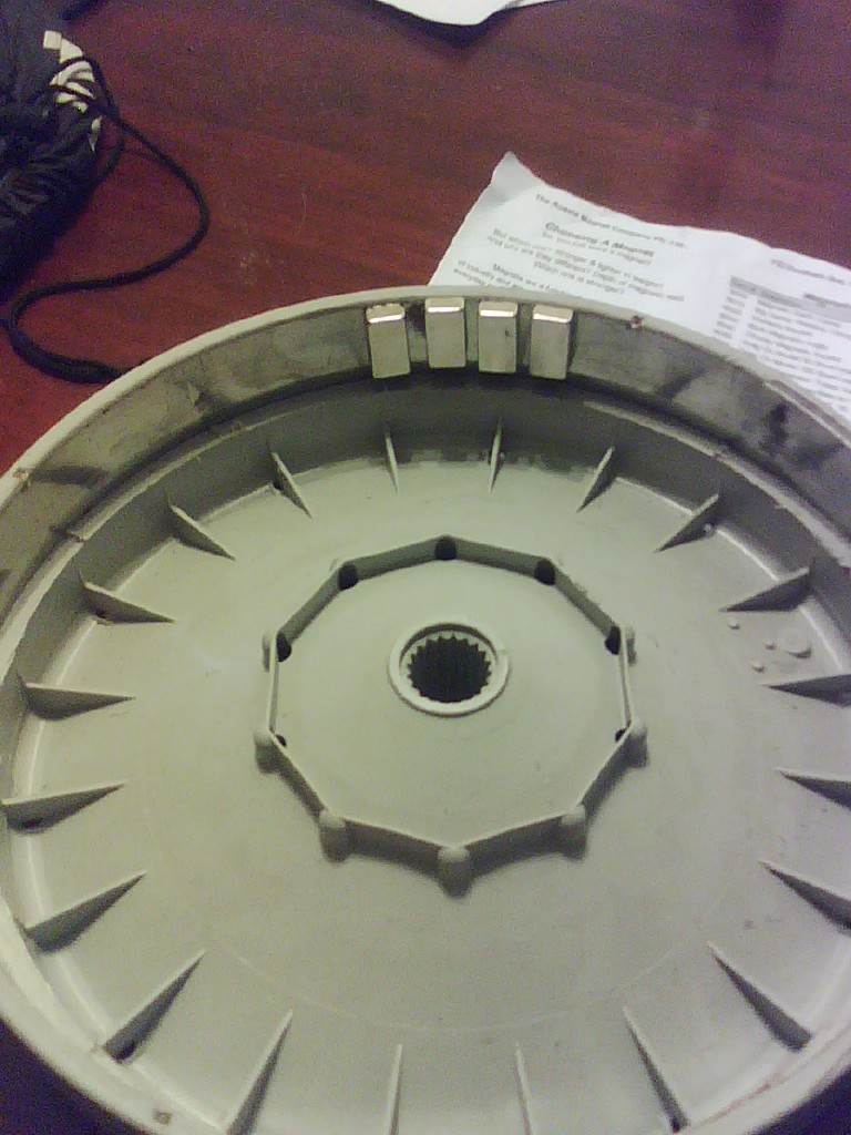 Hi Crew,, have used spacers before this mod,,but ,for me ,it dosen't seem too necessary , as I place a piece of wood(chopstick) adjacent to the finished magnet as I sit the new one down . Ok, you get some that wander, but not many. stacking,,well,thats what I've got many small ones,,(they were cheap). Dunno about the power Etc. Just know these are "Bloody powerfull ! ". Strength of rotor case-- yeah,is a bit of flex,may back it with a 6mm Aluminium disc ,,we'll see. Just discovered I'm 2 or 3 magnets short- "Bummer" another trip to the big smoke to scrounge a few.. have fun Bruce Bushboy |