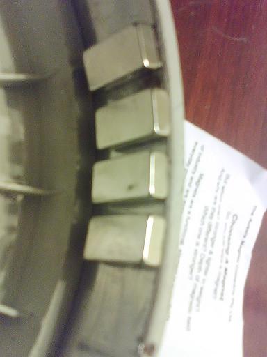 sory for the 1st lot of pics guys, glen could you edit for me, forgot to enter after 1st pic. ta i think spacers would be a good idear to ensure accurate alignment. i will do a lot of test runs b4 actual resining in place magnets cost me 100 dollard inc delivery for 50 not too bad but i dont want to stuff them by rushing. i also have a 100 series rotor and stator, i was wondering if the rotor is stronger as it uses individual magnets. see pics from my reading on neo's having 2 on top of each other increases power by aprox 60 to 70% dosnot double it, but you use what you can get, i have thought of the magnets found in old hard drives, they are 3mm thick with north and south on the one side, you will need to break them in half and twist one half over to align the norths and souths. but there very good, easy to get neo magnets. bummer about the quantity bruce always the way , i ordered 2 extra just in case lol