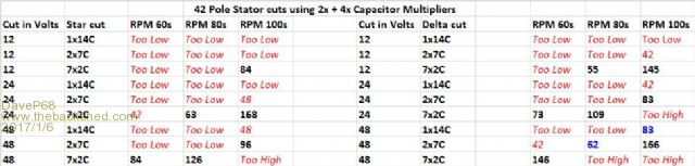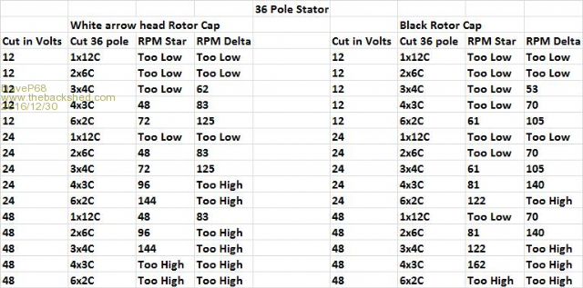 Hi Phill Where it states "Too Low" I mean a Cut in RPM of 12, 18, 21, 24 or 36" I have included 42 RPM on the Delta side so should have said 42. It's there for all to see on the Delta table anyway. For "Too High" Cut in RPM I'm really referring to above 192 rather than the 165 (there is a 168 in the table). I just so happens 192 is the next highest RPM level above 168. So I chose not publish it and anything above that. Here are some Examples of "Too Low" RPM cut in levels; 60s Star 12V Cut in RPM's are: 1x14C is 12, 2x7c 24 That is way too Low. 80s Star 12V Cut in RPM's are: 1x14C is 18, 2x7c 36 still too low. Here are some Examples of "Too High" RPM cut in levels; 60s Star 48V Cut in RPM's are: 7x2C is 336 RPM That is way too High. 80s Star 24V Cut in RPM's are: 7x2C is 252 RPM That is too High. 100s Star 12V Cut in RPM's are: 7x2C 336 RPM That is way too High. 100s Star 24V Cut in RPM's are: 7x2C 672 RPM That is off the charts too High! 100s Star 24V Cut in RPM's are: 2x7C 192 RPM too close to your 200 RPM limit. As it turns out Calculations are derived from measuring the Volts at various RPM levels. Example a 42 pole 60s factory standard star is around 1 VDC per RPM out of a 3 phase rectifier. So 100 VDC out is around 100 RPM +- a volt or so (no load). 80s is 66.6% (2/3) of 60s and 100s is about 25% of a 60s (1/4). It's just simple math to create the tables. All very predictable when the stators are not under load which is exactly where cut in happens. Remember these RPM numbers are "cut in" values and don't represent the higher RPM operating range (above cut in) that power is "going" to be extracted from. I'm going to leave the data table as it is. Not wanting to cause any confusion to those who are new to here and that is exactly why I published in that format. David There are realities if you do not accept, will lead to frustration because you will be spending time on wrong assumptions and the results cannot follow! The Dunning Kruger Effect :) |