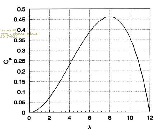 Hi kitestrings Nice work with your automated furling actuator system. Looks like you have more than "partial furling" control demonstrated with the last test. Better than any manual system. That's a big drop from a peak of 1800 W down to 200 W and with the load bank added in down to 20 RPM. From what I know about blade TSR, the RPM even in high winds will not be able to get above 50-60 RPM. The reason for the low, but "controlled" RPM is the blades are fully stalled. This keeps everything well within safe operating limits too. You've forced the blades into a 'power coefficient' of less than 10 % of their optimum operating range which would normally extract the maximum amount of power. Here's a 'tip speed ratio vs power coefficient' graph to illustrate what I mean, more for those that read this that may not understand what I'm referring too. ![]() By the way have you seen my topic on Electronic Dynamic Braking? There are realities if you do not accept, will lead to frustration because you will be spending time on wrong assumptions and the results cannot follow! The Dunning Kruger Effect :) |