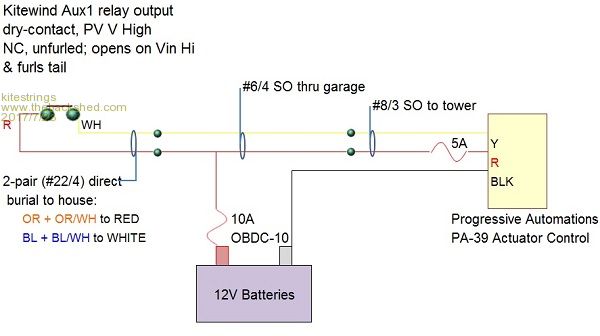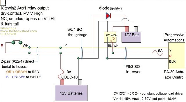 I was reminded that I probably should update this post. Our final schematic has changed a bit. We added another battery closer to the actuator (but still inside the shop), and I also put a diode/isolator in to block this battery from any local loads. The actuator uses a built-in potentiometer, and the controller is a bit sensitive to current losses. Seems to be working well now. ![]() |