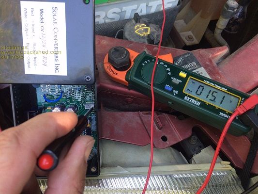 I've added this constant voltage converter. It is a pretty slick unit. Takes a varying input voltage 11-15V, (5A max.) and allows you to set the output voltage. Here I have the thing powered off my truck battery, and I'm setting the output voltage to about 15V. ![]() Current losses have been causing me a bit of grief, so I plan to move the DC source closer to the thing. I also found a aux. battery isolator, so I should be able to isolate power to this thing on a cell that is unaffected by [other] load. Should of probably done this in the first place. ~ks |