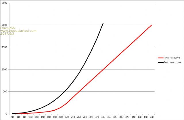 This graph shows what happens on a wind turbine when a Cap Doubler is used as a substitute for a proper MPPT system and directly connected to batteries. Big power loss, at upto 33% on the red line! Black is the true power curve