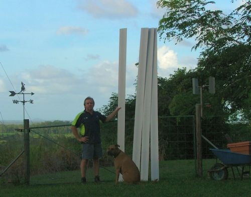 I agree a low inertia turbine with give a small gain in a gusty location, but thats not what I wanted. My timber blades weigh 1.2kg each, my PVC blades on the 2.6m turbine were 2.3kg each, and I had 6 of those! My Southern Cross windmill has a dozen steel blades, the whole turbine would be over 25kg. All these turbines worked perfectly well for me. I could replace all the steel blades on my Southern Cross windmill with hand made carbon fible blades, save 10 or more kg in weight, and maybe it would pump a few more liters per day, but does that mean I should abandon the Southern Cross windmill just because its got a heavy turbine? No, because what it has works perfectly well. Yes if I spend the time I could make a lightweight blade, but that is not what these blades were designed to do. Remember these blades were meant to be cheap, cut to length and easy to put together. We used the same profile the Windcharged turbines have used for many years, see http://www.royalfabrication.com/. The PVC used already has a good UV resistance ( I would need to contact Wes to check the exact ratings ), but yes your would still need to paint them, PVC white isn't a pretty colour. I could have a high performance lightweight blade made, using fibreglass or carbon fibre, in a range of lengths and TSR's. But it would cost you many times what these PVC blades are worth, and you couldn't experiment with them. These are blades for the people. If you want the best, then dont buy these, go and make your own. But if you just want a turbine thats a little heavier, a lot cheaper and easier to make, and has 80% or better of the performance, then these are a good choice. Glenn The best time to plant a tree was twenty years ago, the second best time is right now. JAQ |