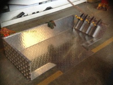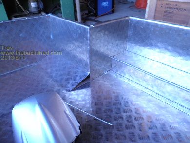 Here are some pictures of the new alloy battery box. It has been changed to alloy so that the box can still be sealed, keeping out dust, water and mud, but is a massive heat sink, letting out any heat generated. So far the highest temperature I have seen is 26 degrees C. The box is made from 3mm alloy checker plate. The hydraulic pan brake I used did not have a deep throat so some sections had to be bent by hand with steel clamped near the bend lines. The box was made up in 4 sections and TIG welded together. Apologies for the poor quality pictures.