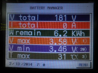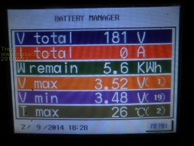 The next day, 15/2/14, at peak pack voltage 3.50am it was 3.63v -3.46v (170mv). By 6.15pm (18.15 on the screen) Relativities had brought the voltages back to 3.58v -3.46v (120mv). As you can see, the large pack does not balance very quick. The number in brackets to the right of the cell voltage is the cell number, so cell 1 is the highest and cell 20/19 is the lowest. The power from cell 1 has to go through several Relativities to get to cell 19 or 20. Relativities is holding them though, every morning the cells have been around the 170mv different. They are not separating any more.