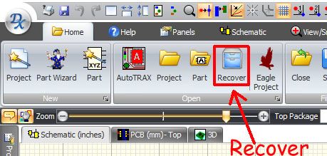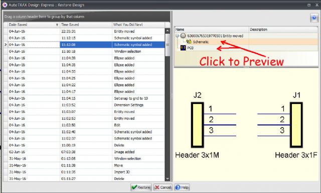 This will bring up a list of all of the automatic system saves (DEX saves EVERY change you do to your project) for those times where you have done something wrong and just can't see an easy way to fix it.. Just browse your recent saves and revert back to an earlier time where you were happy with your project. Don't worry if you realise you have gone back too far your `later' saves are still there.. By clicking Restore you get a pop up that allows you to click on the PCB or Schematic to get a preview of the project before clicking the Restore button (at the bottom of the panel) to bring up your earlier version.