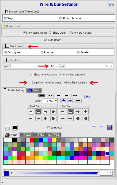 Another TIP, By expanding the WIRES tab (bottom right hand corner) in the Schematic tool bar you can bring up a list of property options for wires and jumpers.