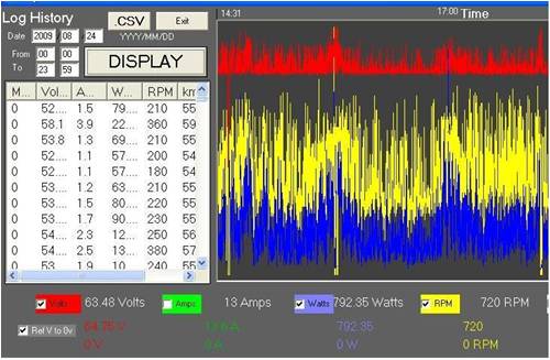 The max power recorded has been over 1000W, but this recorded portion gives 790W max. Average is 200-300W. I have detuned this with a modified loading and shutdown at high windspeeds. There are 3 shutdown periods shown on the graph. Protection in storms is important and this system now works pretty well. The bigger blades will bring the average power up some more. Still have to balance the blades. I have 2 blade sets to evaluate yet. Gordon. become more energy aware |
