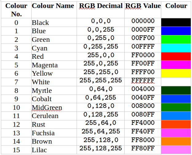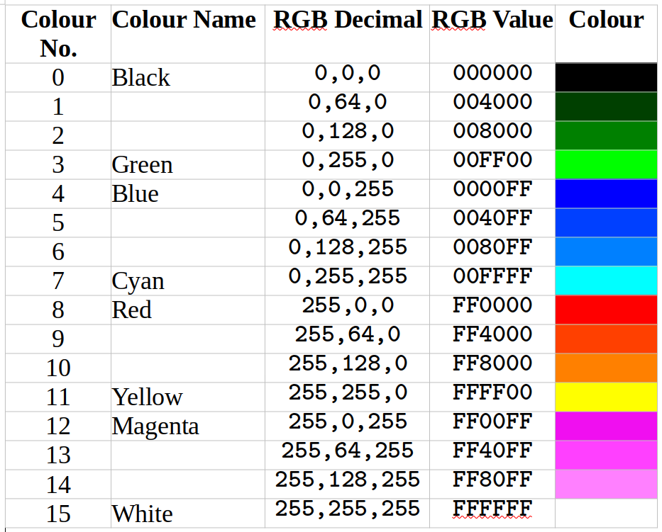 Can I also suggest that an updated version of the manual include the colour palette mapped to the RGB values, the names, and the numbers (if that bug/feature) has been changed?