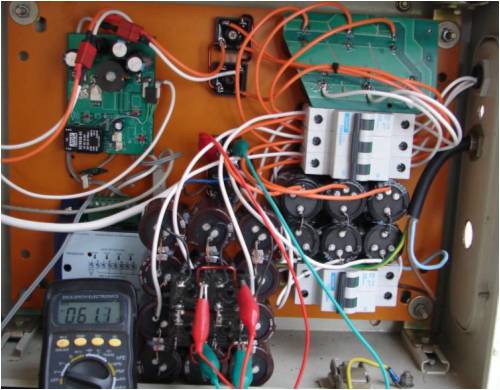 Hi Robbo, I assume this question was directed at me? A 7phase doubler, requires 7/3 times more capacitors and rectifiers for a std 3phase arrangement. This would not be a problem electrically. This would require 28 caps and 8 bridge rectifiers. My doubler is a 4x3 hotmelt glued block of 330uF,400V caps, with rectifiers wired together, atttached with standoffs to the caps. The AC from the mill is connected to the cap connections down the middle. For a 7phase, I would just make a 7x4 block. This doubler is placed in parallel with the normal 7phase rectifier. Windmill cutin rpm will be halved. Here is a pic of my capacitor, voltage doubler. The doubler is the block in the centre bottom. The meter is reading the DC output. The block arrangement keeps the cap & rectifier interconnects as short as possible. There is less risk of shorts and mistakes as well. Gordon. PS This is only a temporary arrangement, conected with clip leads. In this instance, the grid connect inverter is connected as well as the 24V battery. The purpose of the doubler in my application is to reduce the loading on the battery boost DC-DC converter. The caps seem to be more efficient than the inductor/mosfet/diode, but there is no voltage regulation or current limiting components. I have measured 140VDC on the caps, with the grid connect inverter disconnected, but the battery still connected. I intend to add a detector to the grid inverter to enable the doubler only when the inverter is supplying power to the grid. This may be a custom made optocoupled/isolated 3phase SSRelay, that will reduce the voltage protection needed to the battery only, that is already in place. The capacitors I used in the doubler were 330uF, as these were a value I had 12 of. This may be too high. 100uF may be a better value for a 7phase. become more energy aware |