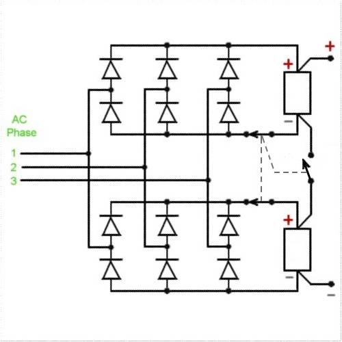 John, There were two viable parallel circuits through both batteries (for clarity, only the top greed shown)but the 3rd path (the short) dominates, passing near all the current. With 3 phase, the + 1/2 cycle of one phase is the - part cycle of the other two phases so a short, though presented as one 1/2 cycle is a total short of the circuit; all phases, all cycles. Gordon, Sorry, the edited schematic is also shorted. I too have these 'Blond Moments' as most will have noticed. I'm sure you'll get it sorted. was working fine... til the smoke got out. Cheers Gill _Cairns, FNQ |