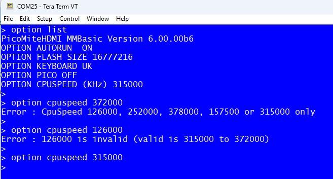 Currently using a Pimoroni Pico Plus 2 and have loaded the HDMI firmware (non USB) b6. All looks good but when I went to experiment with changing the CPU speed, I get the following conflicting messages......