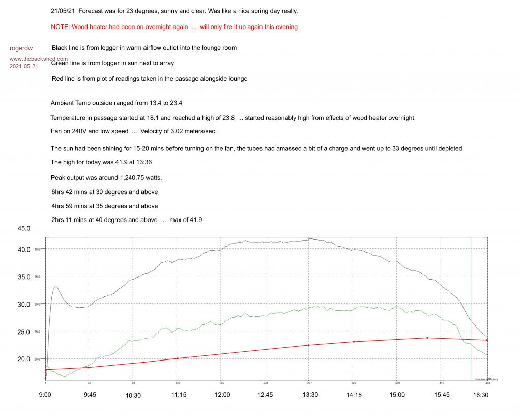 Something else I heard today from Marcel, a guy in the US who has been experimenting with this stuff  ...  he said he's not interested in heat storage now (rocks, wax)  ...  he thinks the hot air should be pumped into a small dedicated room housing a heat pump water heater  ...  to store warm water for later use.