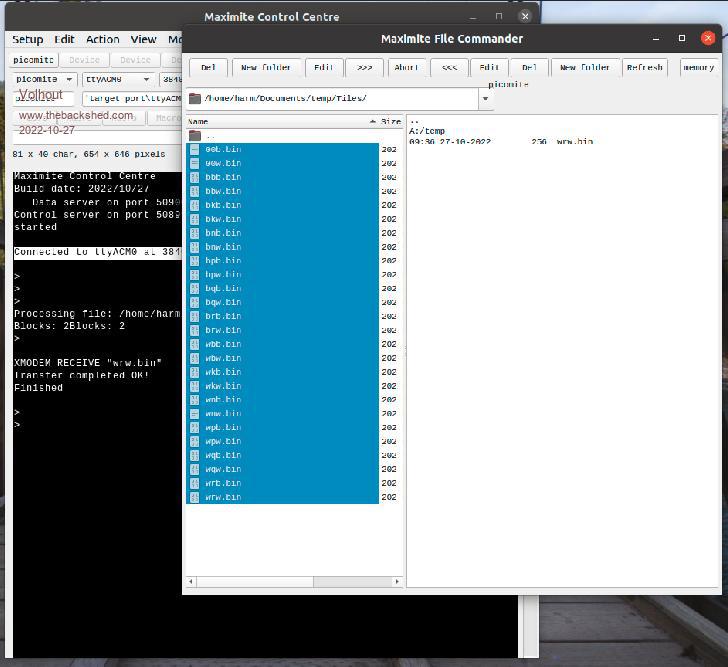 Hi Jim, Have been playing around with the latest version on Linux. Attached picomite V5.07.05RC8 (the latest). Some remarks on the file manager in MMCC - I can select (highlight) multiple files to copy over, but only the last one selected is copied. - When I transfer many files, after some 10 copied files, the file manager stops (no response, no prompt). I copied small BMP files (256 bytes). Volhout Edited 2022-10-26 18:51 by Volhout PicomiteVGA PETSCII ROBOTS |