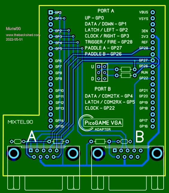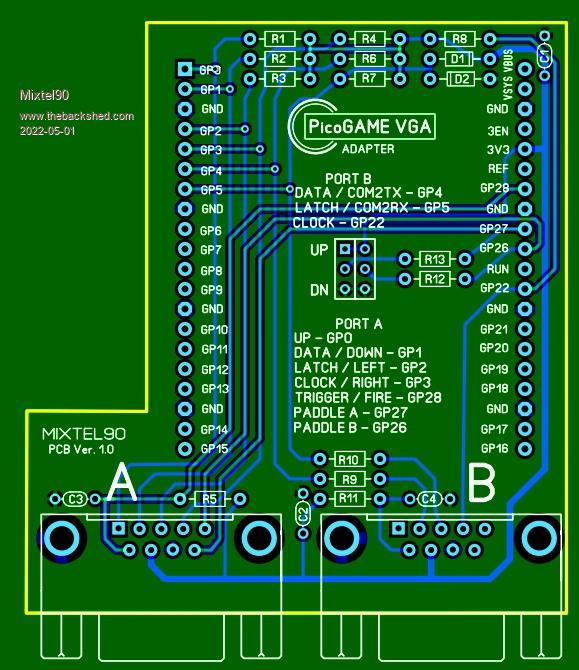 Wow - thanks for the Pico Game VGA adapter board. Looks like another board I’ll need to build. I’m looking at Peter’s VGA board and it looks like the reset button is obscured by your game adapter board. Not a big deal, as I haven’t needed to use it yet. One thing you may want to adjust is the board profile around the notch. I can’t tell for sure, but it looks your board may contact IC2 on Peter’s board. You may want to trim the board where ‘Mixtel’ is on your board.