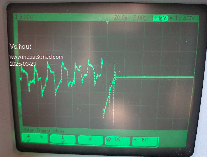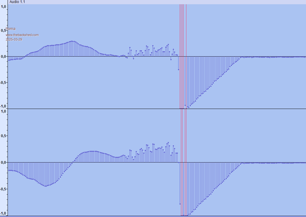 I've checked with the scope and before I could trigger on the pulse - now I can't. PLAY VOLUME 25,25 PLAY TONE 400,400. Set the scope so it just doesn't trigger on the sine wav. PLAY STOP or ctrl-c and it doesn't trigger. Before I was seeing a spike to GND This is the code for stop audio It reads the current PWM level, and calculates my midpoint 2000/4096, then it ramps between the current level and the midpoint over about 1.2mSec. I don't know with my kit how to view this on the scope other, as above, to confirm it never goes outside of the sine wave envelope and it definitely ends at the desired mid-point. The problem with some of your programs is that you are pushing the available resource to the limits. The IF THEN issue was stack overflowing into heap - nothing to do with the code itself. If you just switched to the RP2350..... All I do each time is keep trying to find a bit more memory. The easy solution would be to change the heap size from 100Kb to 96Kb but that would definitely break some of your programs. Please post KONG code and I'll look to see what is causing the problem this time Edited 2025-03-28 21:52 by matherp |