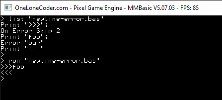 Pretty please .I believe the offending line is in Commands.cpp: void cmd_error(void) { char* s, p[STRINGSIZE]; if (*cmdline && *cmdline != '\'') { s = (char *)getCstring(cmdline); if (CurrentX != 0) MMPrintString((char*)"\r\n"); // <<<<<<<<<< strcpy(p, s); error(p); } else error((char *)""); } IMO cmd_error() should not be printing anything directly, that should ony be occurring in the implementation of error() and even then only if not skipping errors. Apologies that I can't fix/build/test myself and send you a patch. My Windoze machine requires an older Visual Studio tool-chain installed for the purposes of my dayjob and I'm not accomplished enough with the Windoze tools to get MMB4W building with it. Best wishes, Tom Edited 2022-06-03 22:08 by thwill MMBasic for Linux, Game*Mite, CMM2 Welcome Tape, Creaky old text adventures |