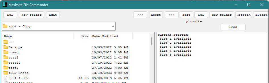 To copy a program from the PC to any of these locations, select the file on the PC and initiate a transfer using “>>>”. You will be prompted to select your target location. AUTOSAVE will be used to load the program into the picomite. If you select one of the ‘slots’, the program will first be transferred to main program memory before being copied to the selected slot. It is not possible to transfer directly to a slot.
