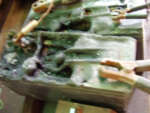 I am cleaning out some rubbish in my shed and came across the two batteries that where burnt in the shed fire I had several years ago, they have been sitting under the bench covered up wit junk for nearly three years now and as you can see are in a very sorry state,