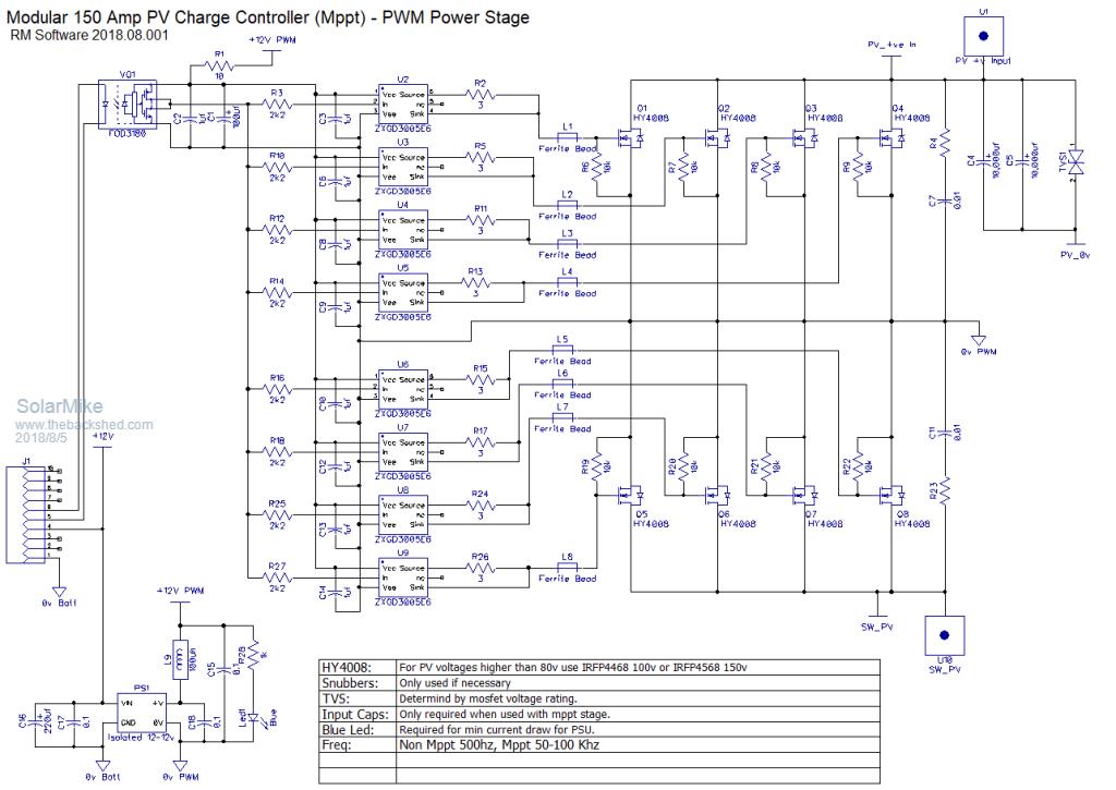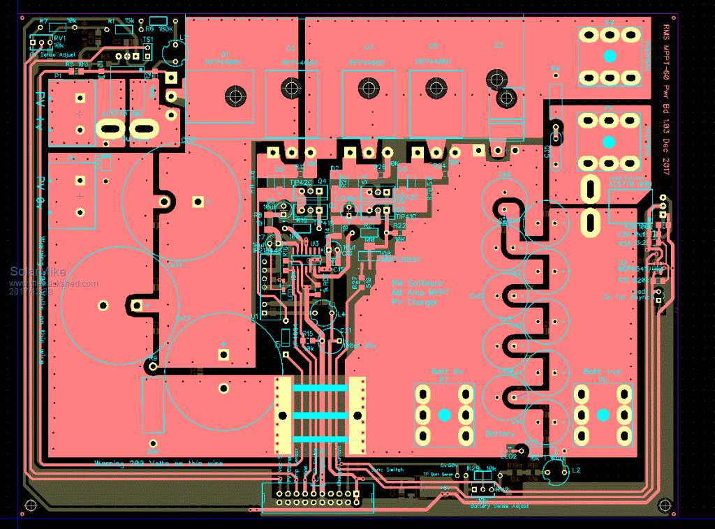 Well its been some months since working on this project, after further looking at the PV requirements, its very feasible to go with straight pwm switching, assuming I can still purchase the 30V panels at the right price. In hind-sight the original design could be improved and built using a more modular architecture; If I treat this project in a similar way to the 10 Kw inverter and construct a number of mix and match boards, I can use them to either construct a simple pwm charge controller or a full mppt variant, depending on the PV requirements. To that end the PWM main switching board has been up rated to 150 amps, components can be optional depending on the max PV current. The second board contains the synchronous buck switch components and can be turned into a full MPPT device just by bolting it to the main switcher board. The third board connects to either the PWM or Buck boards for current and voltage sensing, the synchronous switch reverts to asynchronous operation at low charge currents to prevent very low duty cycle operation causing reverse power spikes that could cause considerable damage. Main PWM Module: ![]() Buck Module: ![]() Sensing Module: ![]() Drive board module has been prototyped, yet to draw it up... more to come. Cheers Mike |