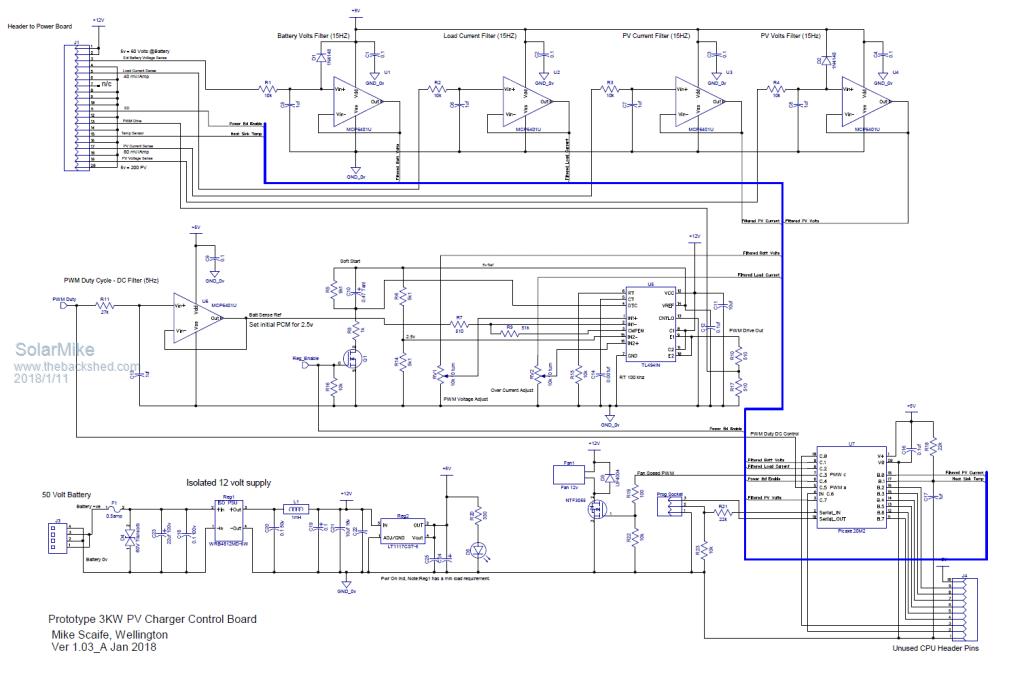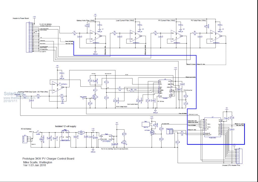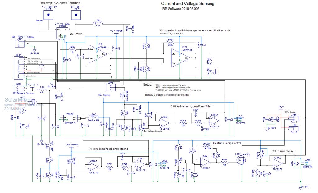 I agree Tony it might be a monster, but hopefully manageable, in that some components can be left off if not required. Changes to the sensing board: Addition of anti-aliasing low pass filters for battery and PV voltage measurement and temperature control sensing. Hopefully this part is now sorted, driver next, unfortunately it will have an associated CPU but this could be any type as most of schematic will be analog - logic components, CPU functionality will be limited to mppt voltage settings etc, display and alarms, the basic controller will be able to be tested/setup with no CPU installed; that's the intention anyway. ![]() Cheers Mike |