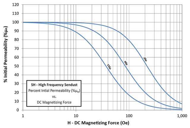 I agree, 22uH is a pretty good target inductance for this. Saturation tester is a must have, its fast and easy and gives final proof that the numbers have not lied. I still like to work things out first though from published data, especially the potential for excessive core loss and core heating problems. That core has a very soft saturation characteristic. At 80 amps the inductance will be down to around 12uH to 13uH which is where its going to be running with 80 amps of constant dc flowing. Its not ramping up from nothing as it does with the inductance tester. As you can see from the curve, at 42 Orsteads (with 125u material) the initial permeability falls to about 45%. If you had used the 60u material, the initial permiability falls to roughly 77% from an initial 60u. 45% of 125u is more than 77% of 60u. But not by much. The 60u material would require a couple of extra turns to reach the same inductance as the 125u material. 125u material 8 turns for 22uH with 80 amps dc ? 60u material 10 turns for 22uH with 80 amps dc ? I think what you already have there will work very well. ![]() If you can increase the turns count from six to eight, that should get you back up into the 22uH region with full dc current flowing. Cheers, Tony. |