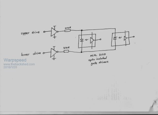 Providing effective shoot through protection can be a very big problem, especially where there can be several different power supply rails that can rise and fall independently at both power up and power down. Things can momentarily go nuts or get into dangerous states. I came up with this idea for my own multistep sinewave inverter. I am using half bridge power stages across +/- 220v dc supply rails. Even momentary cross conduction and its *bang* for sure. I use HCPL 3120 opto isolated gate drivers that have under voltage lockout on the isolated gate driver side. The driver leds are connected in INVERSE parallel and its simply impossible for both leds to be on together whatever else happens. ![]() Cheers, Tony. |