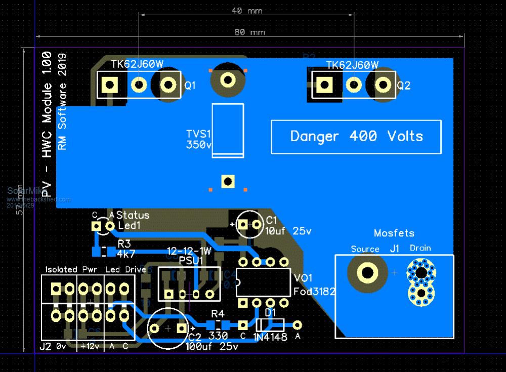 Good one Tony, a 555 does indeed have the 2 comparators that switch at 1/3/... 2/3 supply voltage. You could use it to drive the power module directly if no bells nor whistles were a requirement. Personally I would want an over temp sensing of the HWC to provide a fail safe plan B should the existing thermostat fail and to switch off prior to the thermostat to possibly prevent contact burn out. My secondary HWc thermostat + element costs approx $300, I want to protect it. If anyone wants to make the power mosfet board here are the gerbers. 2019-06-29_195036_Gerbers_PowerModule101.zip Mike |