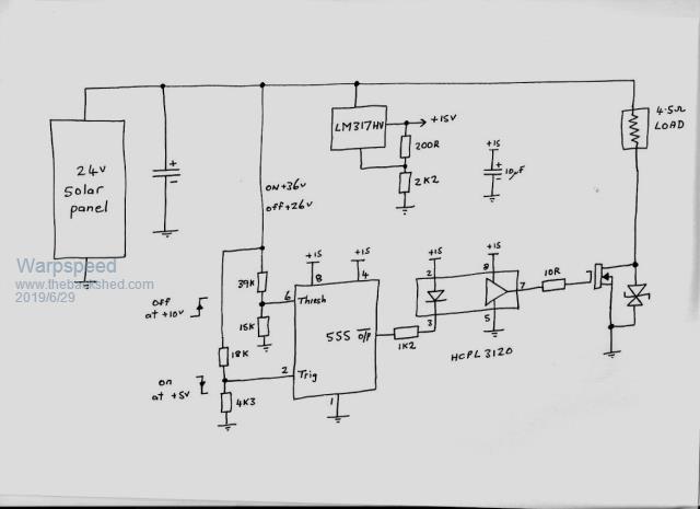 Davo, Mike's original circuit uses a pair of voltage comparators and a flip flop to switch a mosfet on and off. That is really all that we require. Thinking about all this, a light bulb came on in my head that the popular hobby LM555 chip uses two voltage comparators and a flip flop That will work, but the LM555 output goes logic low when on, and logic high when off. So we require a second chip to invert the gate drive to the mosfet. One other requirement is that at sunrise and sunset, the system will go through a miserable state of being starved for power and probably operating very erratically. So it must have a proper under voltage shut down system to ensure the system starts up and shuts down very cleanly without the risk of frying our mosfet in the half on condition. So I looked around for an inverting mosfet gate driver chip that has under voltage shutdown and could not find one. Then another idea... Many of the opto isolated gate drivers such as HCPL3120 or the FOD3182 that Mike prefers, have under voltage shut down built in. Looking back at my testing of a single 200 watt panel, threshold voltages of 26v and 36v seemed appropriate for that, and I bread boarded this: ![]() The only change to the above circuit to make a "full power version" would be the resistors that set the voltage thresholds, a suitable small Chinese +15v (0r +12v) dc power supply, and a few more mosfets. Its fairly primitive with absolutely minimal parts, but all the essentials are there. Cheers, Tony. |