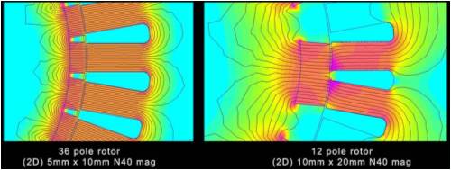 You will see that the flux is concentrated exactly where he wanted it, in the teeth where the coils in question was seated. Every line leaving every magnet is closed somehow. Note the rotor, all those lines joining up the magnets return circuits. If you made the rotor out of aluminium, flux would jump from the front of the magnet straight back to the back, and never see the gap you want it to jump. Thats why you must have steel backing the magnets so the return path is assured. In the axial flux types, we use heavy steel plates at least 8mm thick to achieve the same thing. We use aluminium as a jacket precisely because it does no affect the static magnetic lines and does not encourage leakage of flux from the front to the back, it just mechanically holds the mags in place (dinges used epoxy instead I think). We cannot use Aluminium if the magnetic fields will cut it.. ie in the stator, as we just generate enormous eddy currents. Or any place where alternating or moving fields may cross the al. The best way to do it is to have a steel rotor with mags facing the stator, held in place by some magnetically inert material. Think Magnetic CIRCUITS, and you will do a lot better. Pntrbl, It's all to complex for me thats why I suck up to Dinges and conn him into doing it for me.