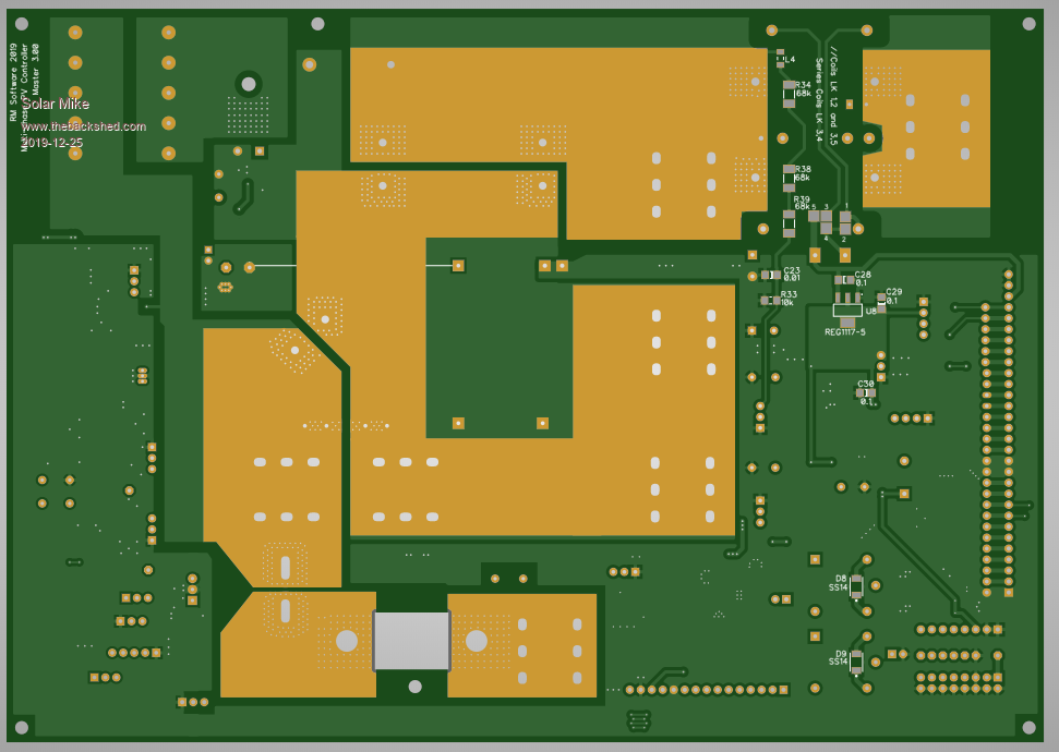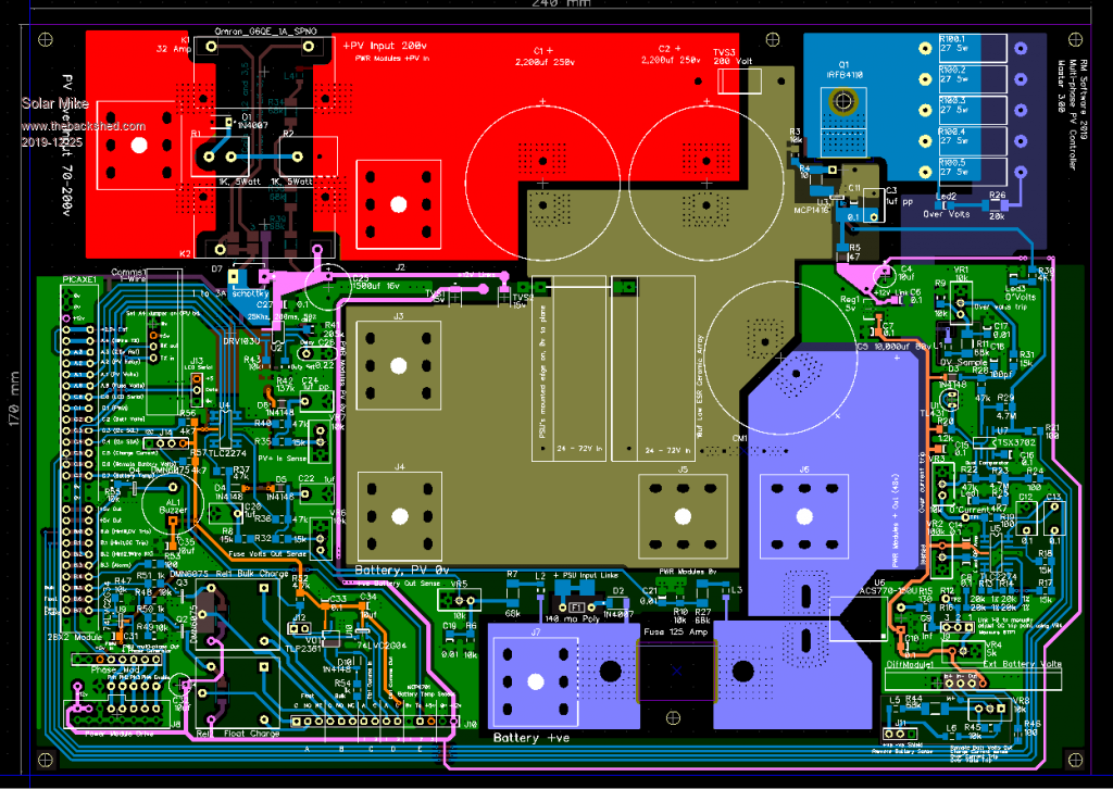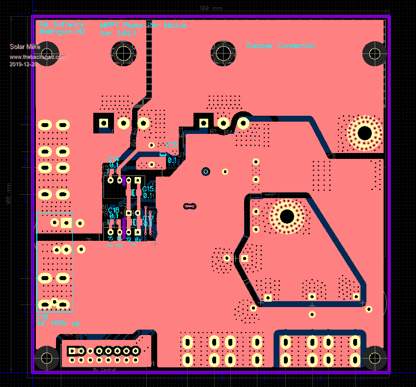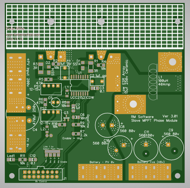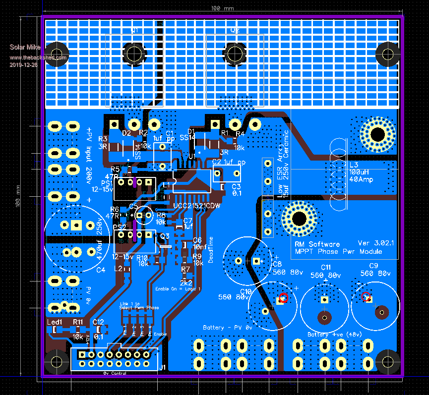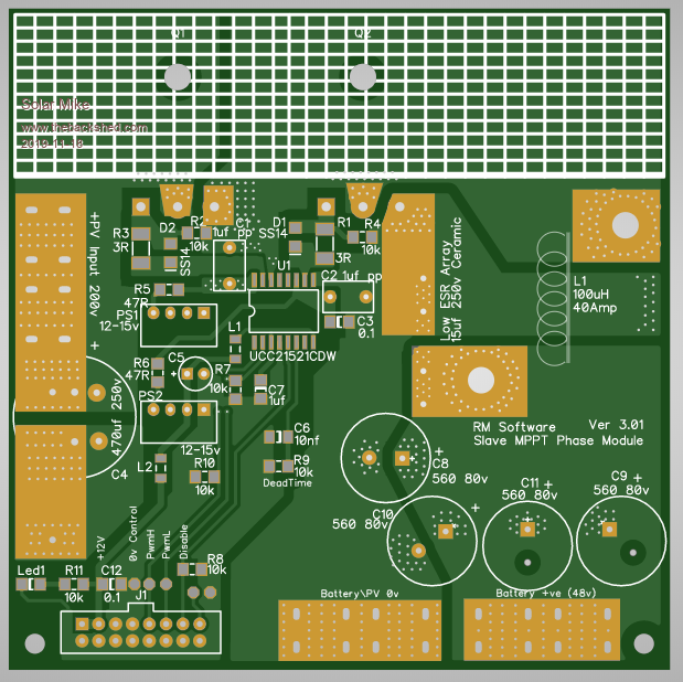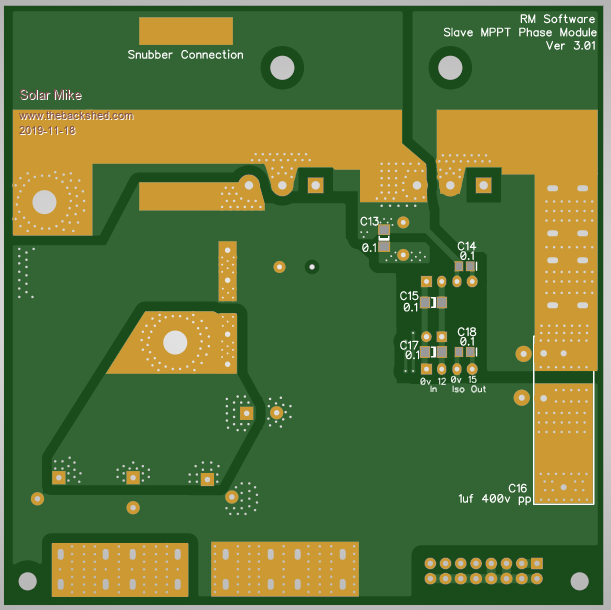 Module PCB completed, its been a bit of a mission to get everything inside a 100 x 100mm board. I don't have a schematic for this yet, will do this in the next few days in between renovations tiling the bathroom and kitchen, as a way of checking there are no errors. The white hatched area is covered by a nylon insulator then an alloy right angle for mounting the two mosfets, the 4 phase boards are stacked above each other bolted to a common heat sink - each designed for 30 odd amps. High PV and Battery current connections are made with bus bars bolted to tin plated brass right angle pcb connectors that protrude from the edge of the pcb. Buck inductor is wound on one of These Cores. The ribbon cable connector with control power (12v) and drive signals plugs into all modules, note its 0v line is isolated from the modules high current lines. Edit: (Just noticed an error on this cable connection, will fix it) Top: Bottom: I need to make a mother board now with CPU etc, This will also have some larger Bulk input capacitors on the PV side, output ones don't matter so much here as the battery is a near infinite capacitor. Cheers Mike Edited 2019-11-18 06:12 by Solar Mike |