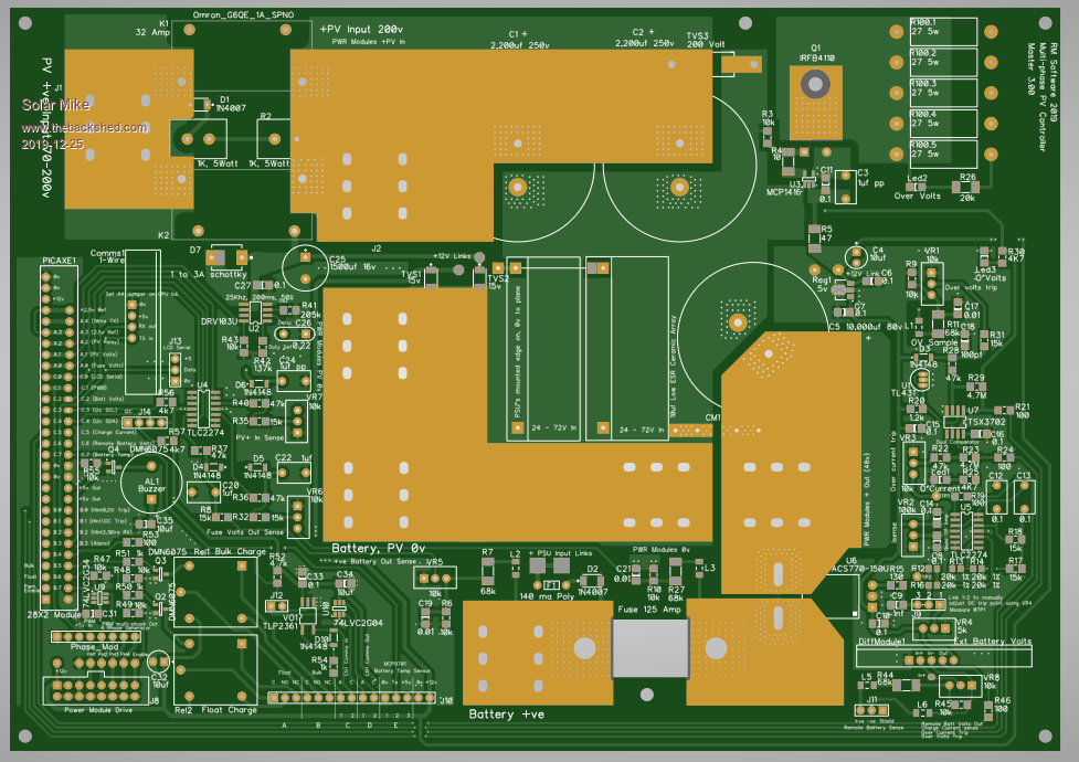 About time I got back to this again, the host multi-phase controller pcb has finally been designed, 4 phases have been implemented allowing use of 1 to 4 mppt buck converter boards mounted above the main pcb. Vertical copper bars bolt to the 120 amp connectors on the host pcb, the power boards connect to these via right angle connectors. Host board has a Picaxe 28X2 cpu module via plug on connector, allowing a swap out with another cpu for experimentation later, the 4 phase PWM output runs at 62 Khz at 10 bit resolution, with a solder link on the power modules to select the required phase drive. I have added modules for remote battery voltage sense and 1-Wire local area network. Multiple controllers can be slaved to a master for common control of voltage and charge end points. I2c and serial outputs can be connected by wire headers. Added a couple of relays for activation when in "Bulk" or "Float" charge states. Will post the circuit soon as I get it done. Cheers Mike |