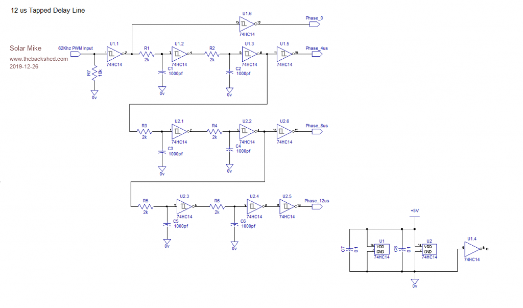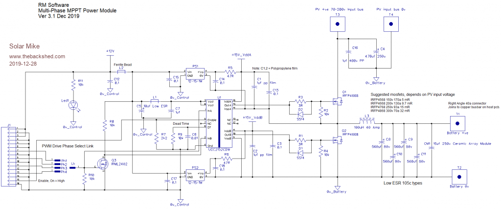 Will make a start on the schematics: The 4 phase circuit has a number of Schmitt trigger inverters acting as 2uS delay units, with delay taps at 4,8,12 uSec. Implemented on a small pcb that plugs into the main controller board. Such a simple circuit means the minimum PWM duty cycle cannot be smaller than 2uS, with PV voltages approx 2-3x the battery voltage, this shouldn't be a problem as long as the PWM frequency sits around 62 kHz; any higher and the delay sections will need reducing in time, possibly requiring more of them. Main Controller Circuits: MP_Controller_P1.pdf MP_Controller_P2.pdf Will add others later today. Cheers Mike Edited 2019-12-26 21:50 by Solar Mike |