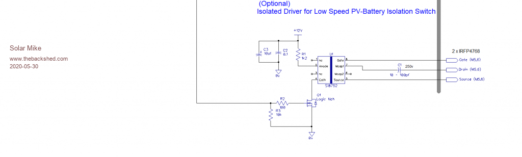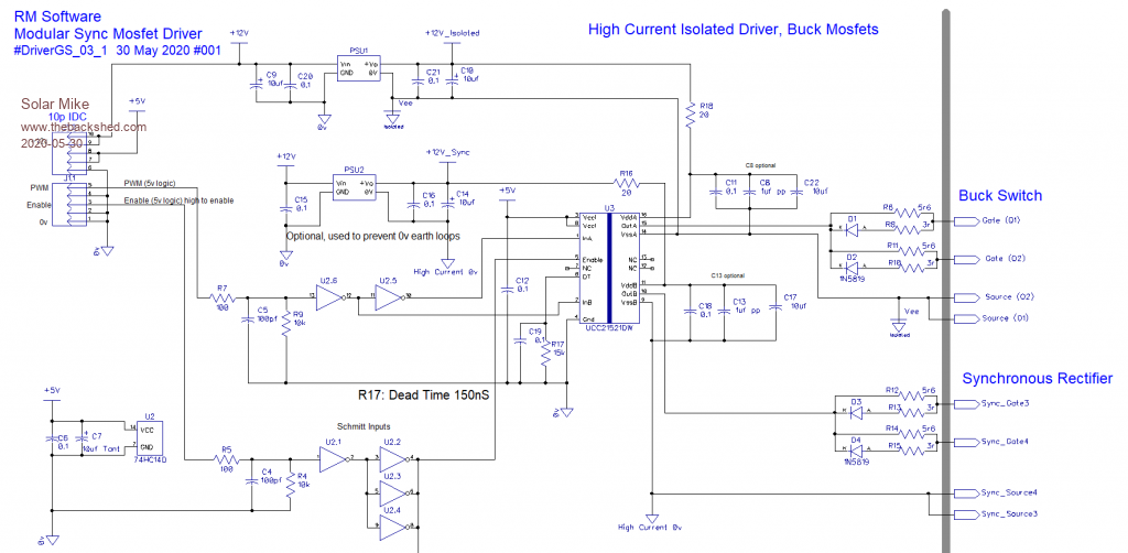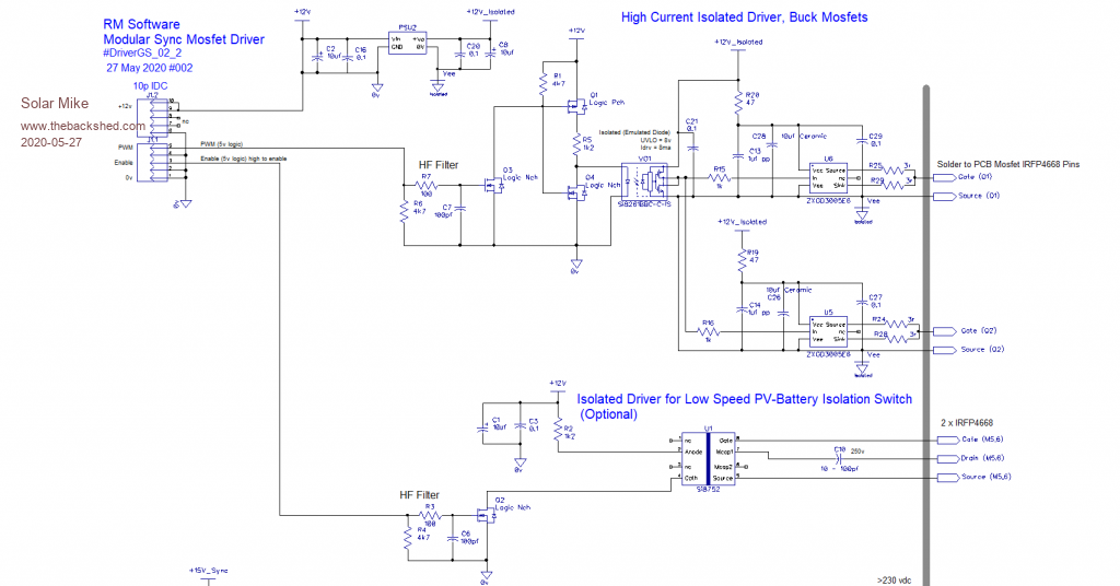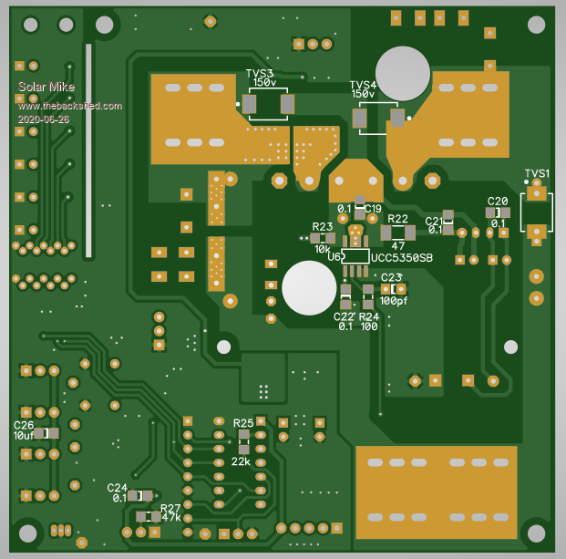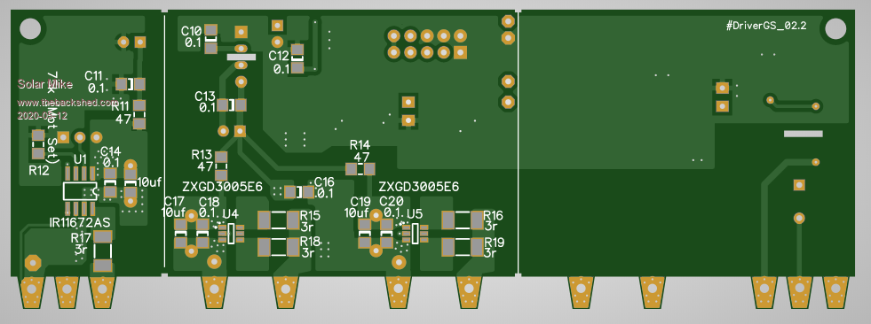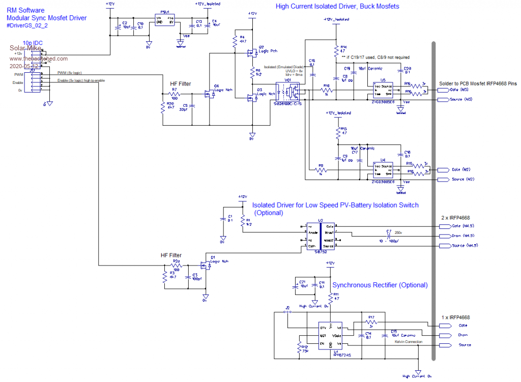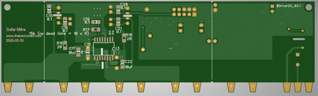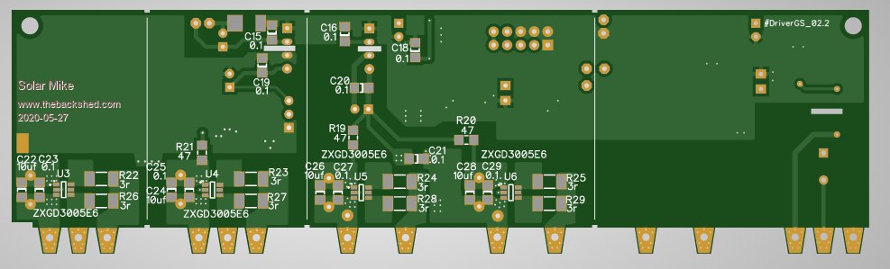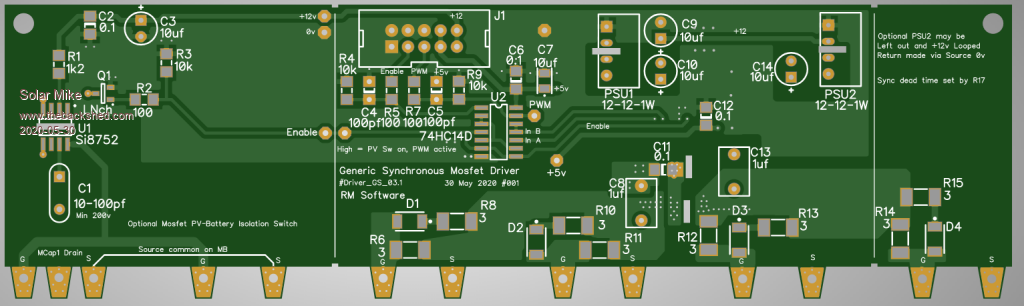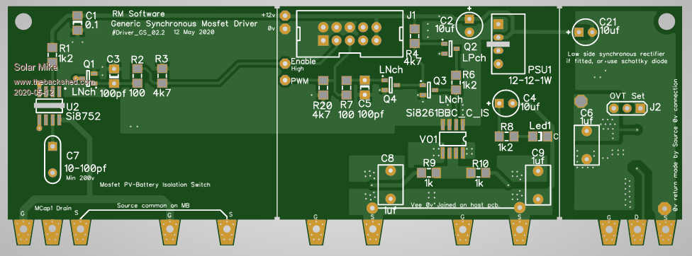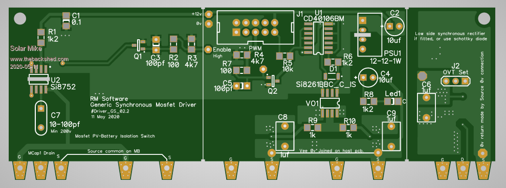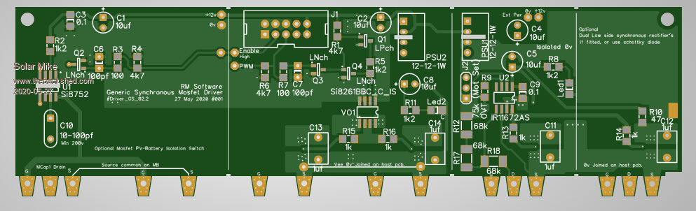 Well I still haven't sent those files off. I want to do some more experimentation and have made a more generic module that has these optional functions (129 x 46mm). 1: Synchronous mosfet driver 2: PV Isolation Switch 3: Buck driver I want to run the mppt section at 62 to 100 Khz, so a better design is needed. The pcb has the functionality such that the buck driver may have the optional sections simple cut off with tin-snips. In light of the work Poida is doing, the mosfet PV isolation switch may not be required or replaced by a relay. The synchronous rectifier section similarly maybe chopped off if not required and a schottky rectifier used instead. Rather than send off multiple board designs its easier to do it on one. The buck driver section is always needed and maybe used standalone, I have changed the design of this section to use a modern fully isolated emulated opto type coupler driver, Si8261BBC-C-IS this version of it has under voltage lockout set at 8 volts and low 2.5//4 amp capability, the chip drives dual ZXG3005E6 10amp drivers positioned directly at the gate of each mosfet. The mosfets used IRFP4668 need quite a high gate current to switch quickly and as I have at least 50 of those tiny ZXG things, about time they were used. Here is the PCB, will draw up the schematic to check it. Cheers Mike |