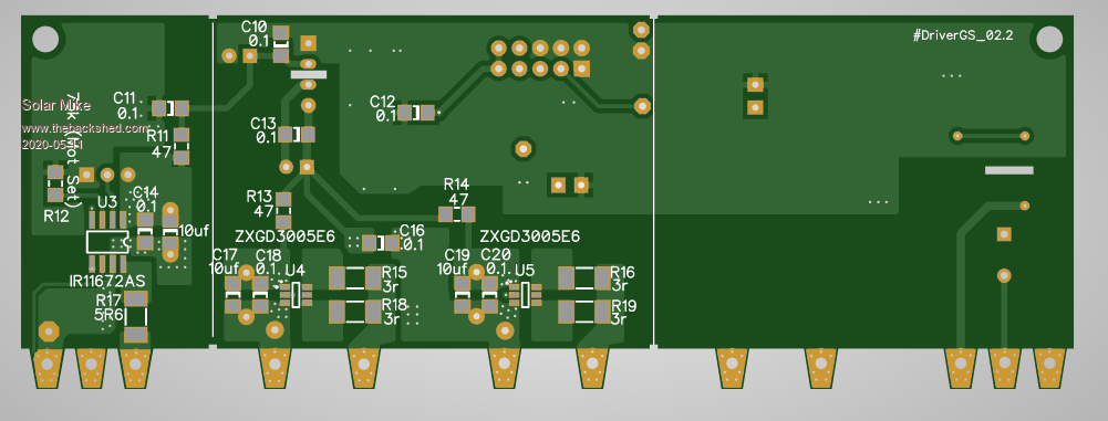 Made changes to the generic driver module to allow it to run with > 200 volts input, the synchronous rectifier driver chip IR11672 has a max sense input of 200v, have added a resistive divider to allow in excess of 250v; this change also affects the chip voltage sensing points, but seems ok looking at the spec sheet. As these drivers have limited current drive of only 2 amps, have implemented supplementary boosters for each mosfet using the ZXGD3005. Have made the pcb so unwanted optional sections can be simply cut off, rather than designing multiple boards, the cut off bits can also be used standalone. Noting that all mosfets are mounted spaced 28mm apart on the heat sink. Will make a schematic to check it. Cheers Mike Edited 2020-05-27 19:06 by Solar Mike |