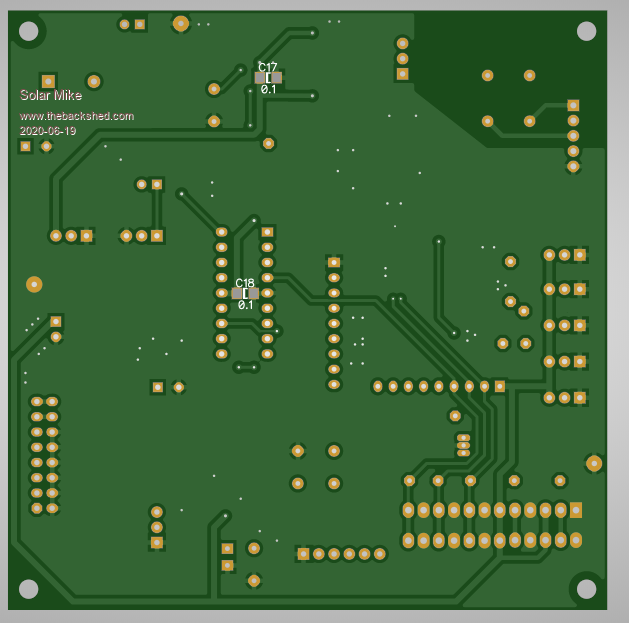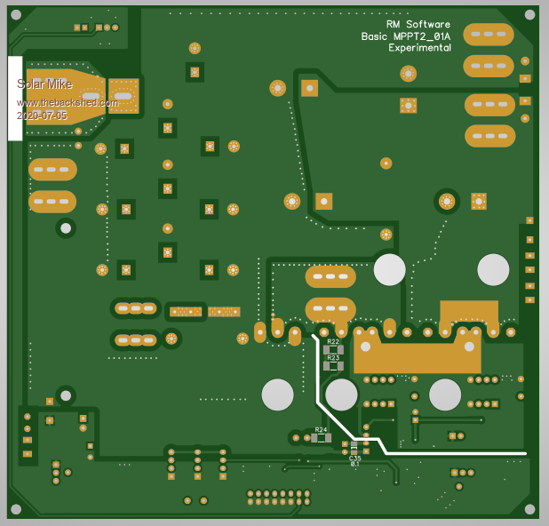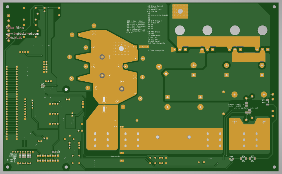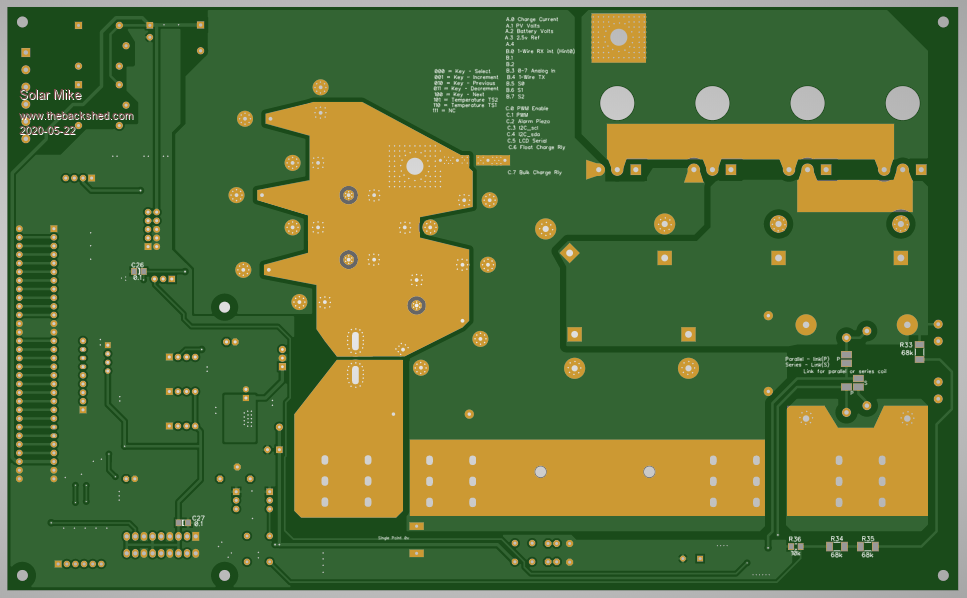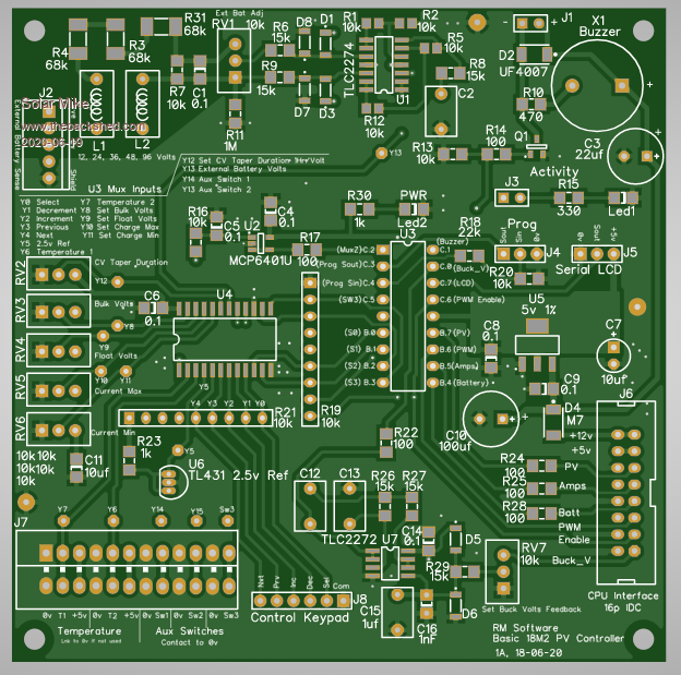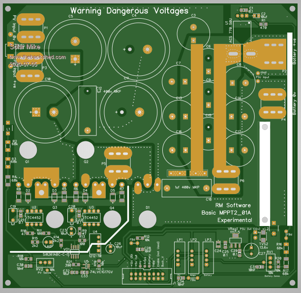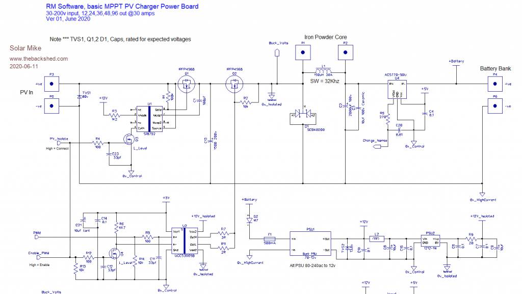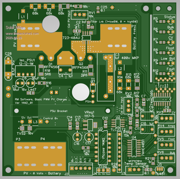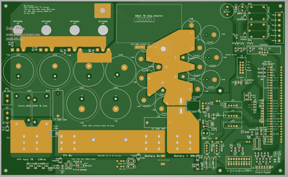 Cool, boards are done and being shipped back... meanwhile I need a couple of smaller controllers that can be used for 12 to 96v battery and up to 200 vdc input at 30 amps charge out. I have a couple of 1Kw UPS units that I want to charge via PV panels; Expect most of the time charge currents will be < 20a, so physically smaller. Have come up with this minimal no frills design, fits on a pcb 165 x 165, cpu (Picaxe 14M2) fits on a daughter board and connected by 16p IDC cable. PWM frequency is 32 kHz and a small 50mm OD. powder Iron core is used for the inductor. There is a mixture of hole sizes for the electro's, as components used are dependent on the expected PV input and battery voltage. Will draw up the schematic. Cheers Mike |