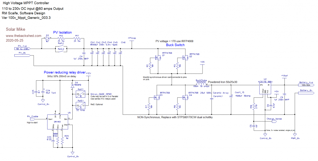 We have similar rules and regs here, I think if you stacked them in a pile they would be over a meter high, however 100 volts dc isn't an issue here. Everything has to be installed as per some NZ standard regardless of output voltage , lower voltages however don't require an electrical inspection. As a NZ qualified electronics tech who used to work on high power installations where the voltages exceeded 5 KV DC, all this low voltage stuff isn't an issue for me at least, but not recommended for non-qualified members of the public to play with; If in doubt get advice from a suitably qualified electrician. The output 100v is nominal, my lifepo4 bank floats at 105.6v and peaks at 112v so that's what this controller will be putting out, however as its using 250 vdc output caps, can be made to run at anything below that. Cheers Mike |