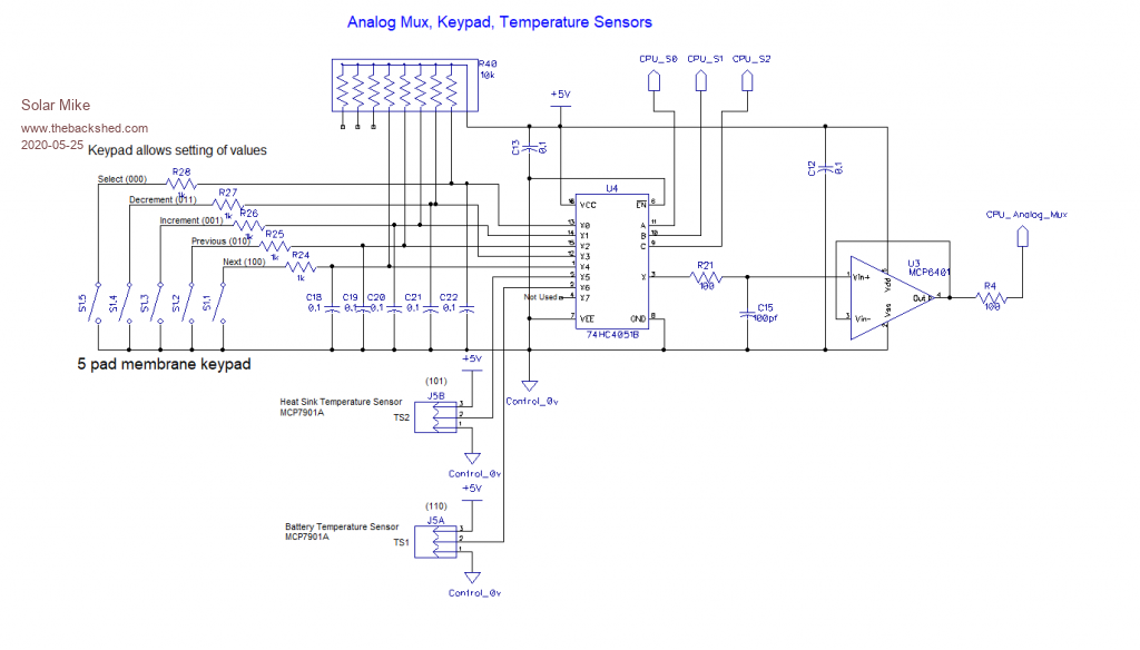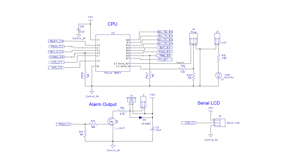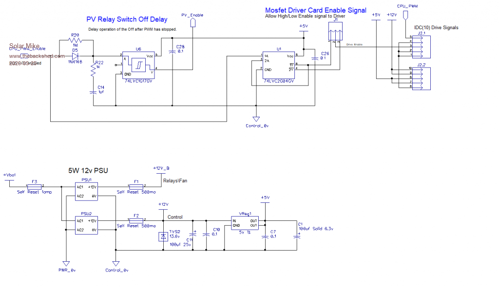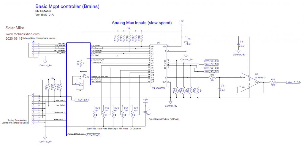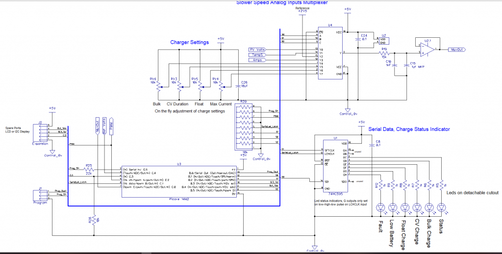 This has been an interesting exercise, found a couple of issues in the circuit, and made some changes to the keypad connection. Otherwise no errors that I can find. I will have to modify the mosfet synchronous driver card as the driver chip "Drain" voltage sense has a 200v max, so will add a resistive divider. Here is the bulk of the schematic which I drew up to check the pcb layout, not shown are the actual CPU card details or the 2 charge state output relays, reason I have for using the plugin CPU card is to make it an easy exercise to replace the CPU with another, like one of the "Mite family" Cheers Mike |