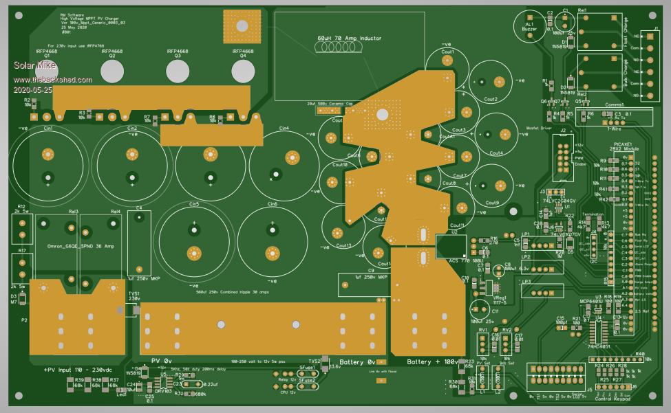 Well the few more items remaining has expanded some what; after tromping all over my roof armed with a tape measure last week to work out where to put the new PV panels that have now arrived; I'm limited to various series combinations that will fit. The existing solar thermal hot water panels residing in the center of the roof means the best combinations of PV that will fit are groups of 5 panels in series, so the mppt voltage will be 156v with an upper unloaded value of 192v. Means I need 250v capacitors of which I have none, after re-doing the calculations for the buck converter components I need an input of around 2000 to 3000uf 250v with approx 30 amp ripple rating. The output caps require approx 1500uf with 26 amp ripple. The previous design needed a few modifications to the pcb to fit the extra components, I have implemented a relay for the PV isolation should that feature be required, or shorted out if not. Added modular plugin pcb's for the double pole analog filters and edge mounted cpu card. The mosfet driver card solders to the pcb pins. RS sell these 30mm dia 560uf 250v items each with a 5.43 amp ripple rating, so 6 are required for the input. The output capacitance is better achieved with many smaller items in parallel, These 100uf ones each have a 2amp ripple rating, so 15 in parallel will give me an easy 30 amp and 1500uf. I could have used the bigger 560's but then I would have too much capacitance and the voltage feedback response would be way too slow for stability. Here is the first cut of the new layout. Cheers Mike |