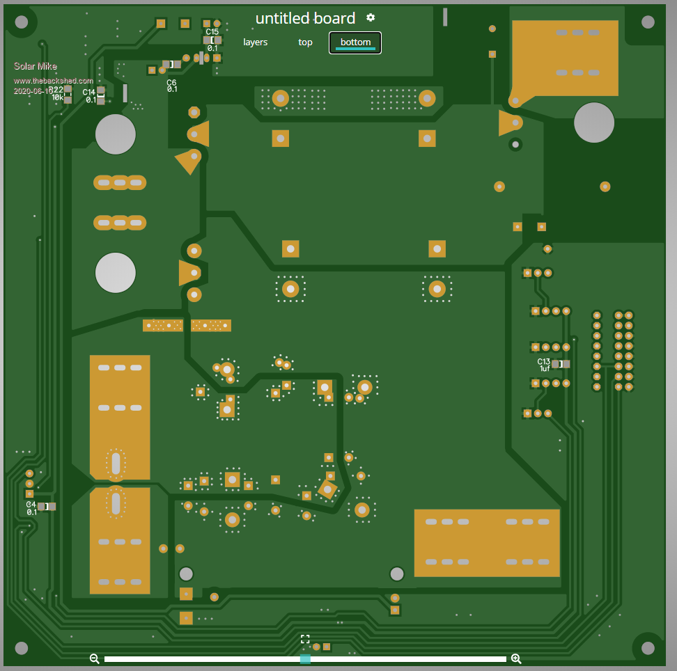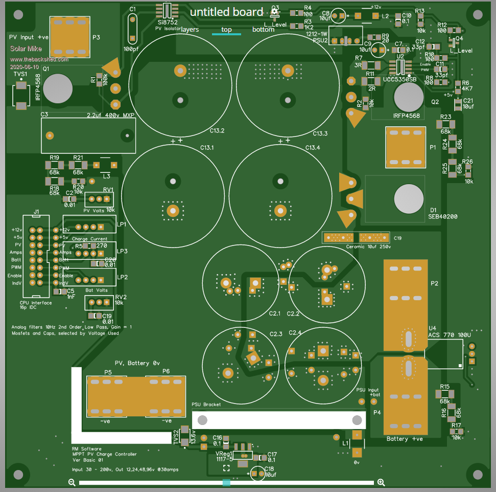 While waiting for boards to come back, have thrown this experimental non-synchronous design together, uses a different switching arrangement of the buck mosfets, so when they are off, there is no self discharge of the battery back into the source supply or PV array, the MPPT module uses the same controller as previous design. PCB measures 167 x 161mm. Will be using this for a 5KW battery charger, as we need one with a variable current setting front panel control, to stop placing too much load on the generator. Finally MicroMetals in USA got back to me, the cores I want are readily available but in min quantity of 50, I have asked for a reseller who can sell me 10, but have had no reply back. Cheers Mike |