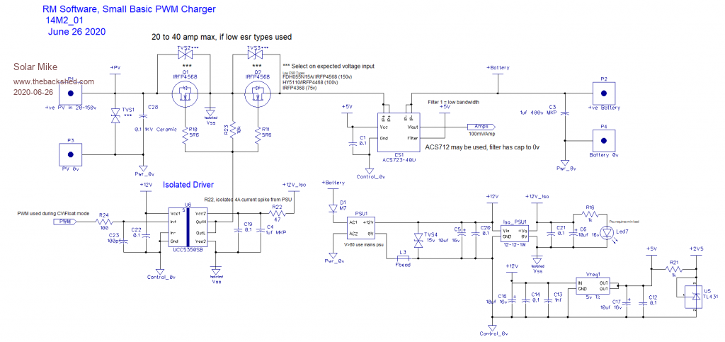 Its been a week, no replay from my emails to Micrometals about shipping, perhaps they don't want any sales, a lot of NZ companies are also like that, send an inquiry email and never get a reply back... Anyway I have decided the above charger is too large to fit into my UPS units, so that design will be used elsewhere. I want tiny but still 20 to 40 amp range, so have designed this PWM unit using a Picaxe 14M2, fits on a 100x100 pcb, very basic, uses leds to show state of charge, however an LCD display (serial or I2c) can be added via an expansion port. Now I will have to make time to build it, along with the others. Edit: schematic has a couple of spelling errors, they can stay as they are.. Cheers Mike Edited 2020-06-26 22:00 by Solar Mike |