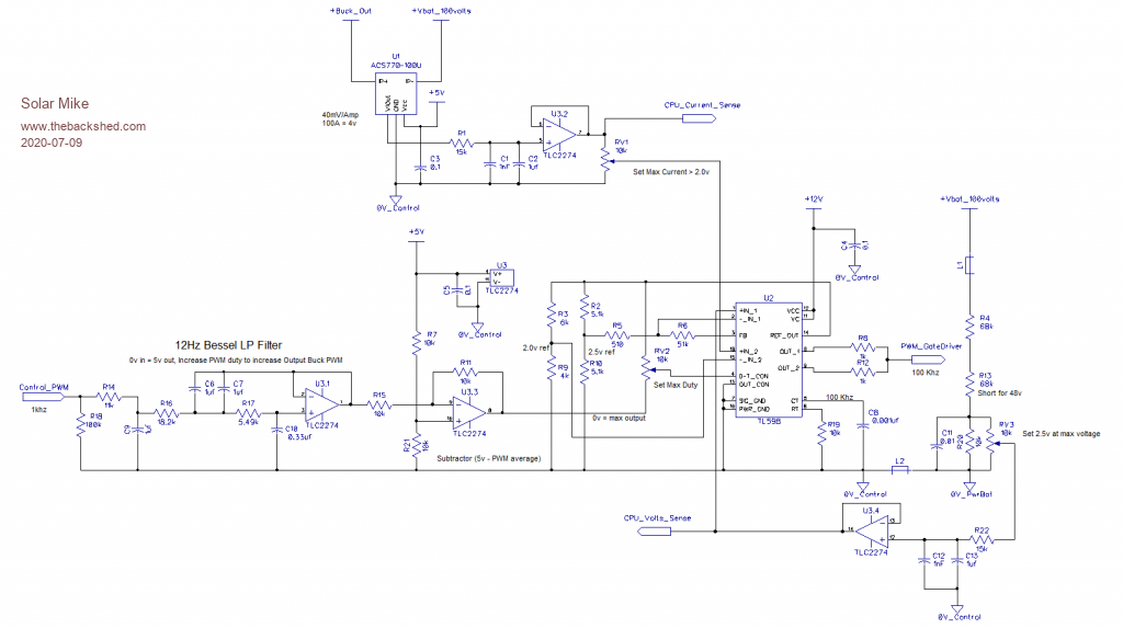 Seeing as MicroMetals can't be bothered to reply and tell me where I can purchase their cores from, will come up with an alternative solution for use with the generic controller. Having a high frequency PWM drive to the buck inverter makes things like finding a suitable inductor core easier; smaller cores are more readily available online and being lighter, cost less for postage. Have decided to use a pwm power supply chip to generate the PWM at 100Khz and maintain a fixed output voltage. The TL494 family of chips have a dead time voltage control input that allows external control of the chips PWM duty cycle. The CPU only needs to have a DAC output that can be connected to the chip to vary its output. I have put this schematic together that uses a 1Khz 10 bit pwm control signal to vary the duty cycle and thus output voltage of the PWM controller, for this have used the TL598, which has totem pole drive outputs, otherwise near identical to the TL494. Control PWM is passed through a bessel filter to produce an average DC out, 0 duty cycle will produce 5 volts out, as control duty cycle input is increased, the output will move closer to 0vdc; connecting this voltage to the DT control input allows the CPU have direct control of the psu chips output drive to the buck mosfets. That's the theory anyway, will make a small pcb to host the extra components to test. Cheers Mike Edited 2020-07-09 16:11 by Solar Mike |