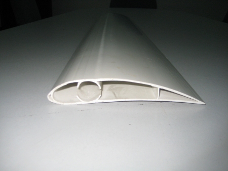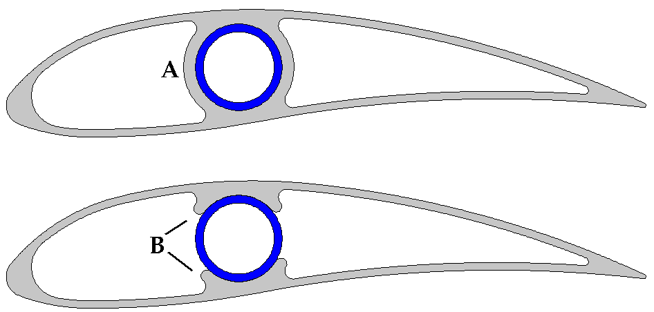 OK, an update on the progress Wes and I have made. We are looking at a PVC extrusion, shown below. The PVC section is shown as gray in colour. The extrusion is hollow, with a minimum wall thickness of 2mm. The nose section is thicker at 6mm to allow for wear and impact resistance. The chord length is 160mm. In the middle of the extrusion are guides ( B ) or a hollow tube ( A ) to allow a 22mm diameter steel tube to be fitted, shown in blue. The steel tube will fit along the full length of the PVC blade, and continue a further 100mm or more out the root of the blade, where it will fasten to the turbine hub. The PVC blade will be riveted to this steel tube at several places along the blades length. There will be a molded wing-let that will fit into the blade tip and glued in place, and a cover at the root end of the blade to keep the weather out.