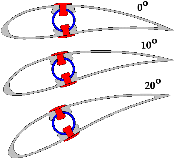 This combination will give us a strong and light blade thats easy to manufacture. Now for the clever bit. By heating the PVC blade to soften it slightly, we can twist the blade around the steel tube. Then just drill and rivet the blades to the tube at the new angles. Or the tubes and blades could be pre-drilled, so just heat and twist to line up the holes. This means we can achieve the best twist and angle of attack for the entire length of the blade. We could see these PVC extrusions sold in lengths, untwisted. Just add the steel tubes, heat with a hair dryer and twist away for whatever TSR you want. Shown below are angles of 0, 10 and 20 degrees, typical angles for the tip to root. Rivets in red.