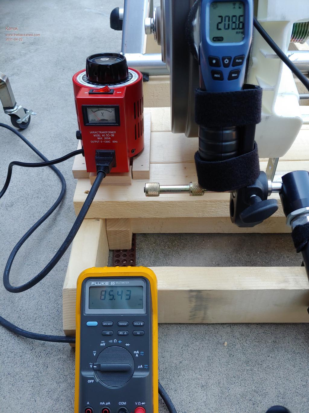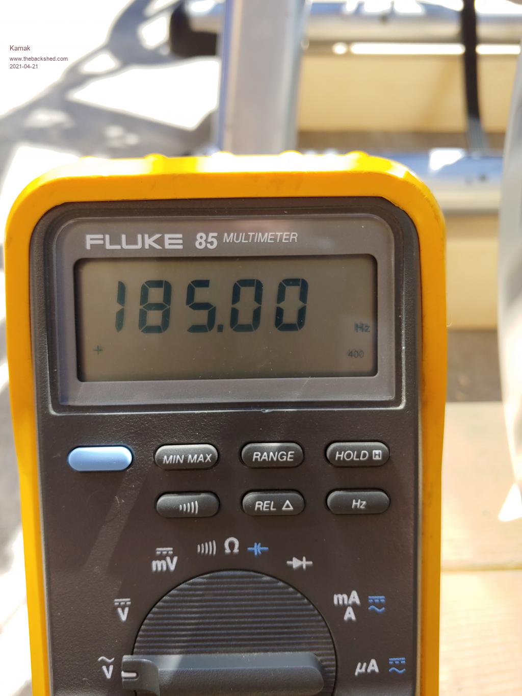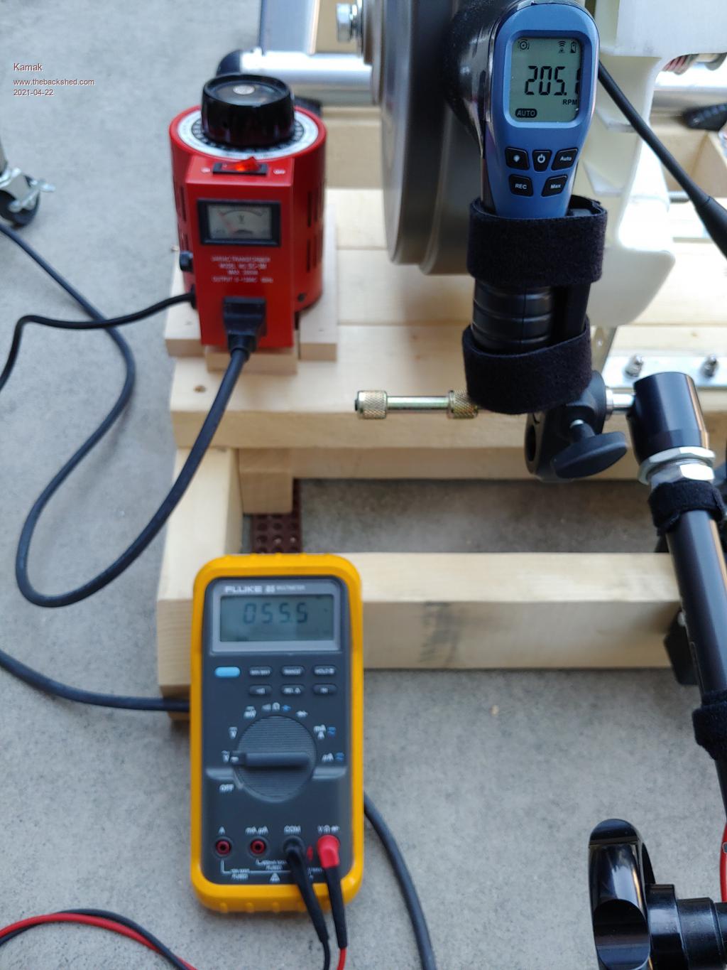 confirmation of RPM through two methods of measurement. Digital tachometer and electrical AC frequency. Approximations due to fluctuating loads. Tachometer reading of 205/209.6 RPM A voltage reading of 55.5V DC A frequency reading of 85.4Hz 85.4 Hz(cps)/24 N|Spc x 60 spm = 213.5 rpm cps(cycles per sec), N|Spc (pole pairs per cycle), spm (sec per minute) ![]() ![]() Edited 2021-04-22 06:39 by Kamak |